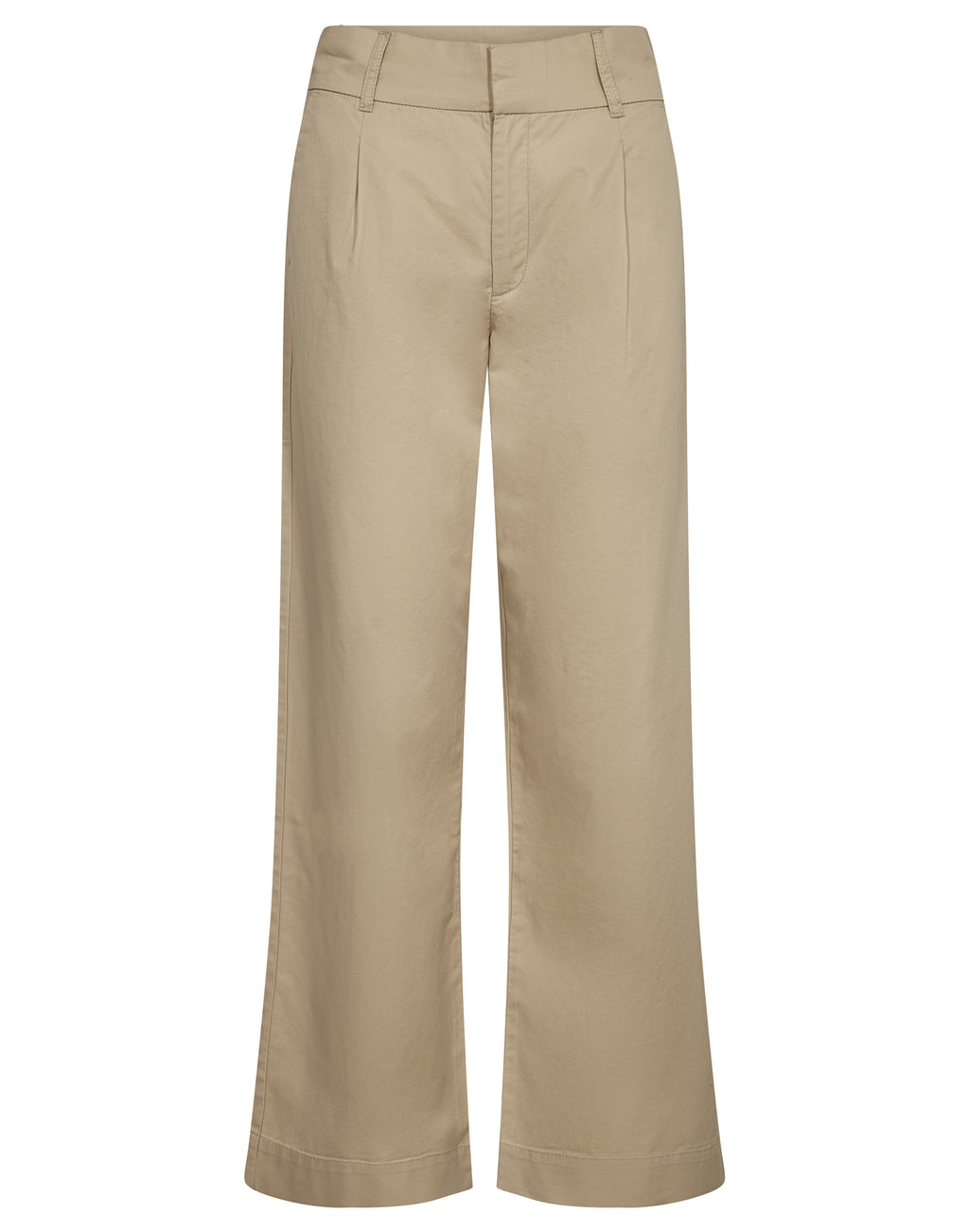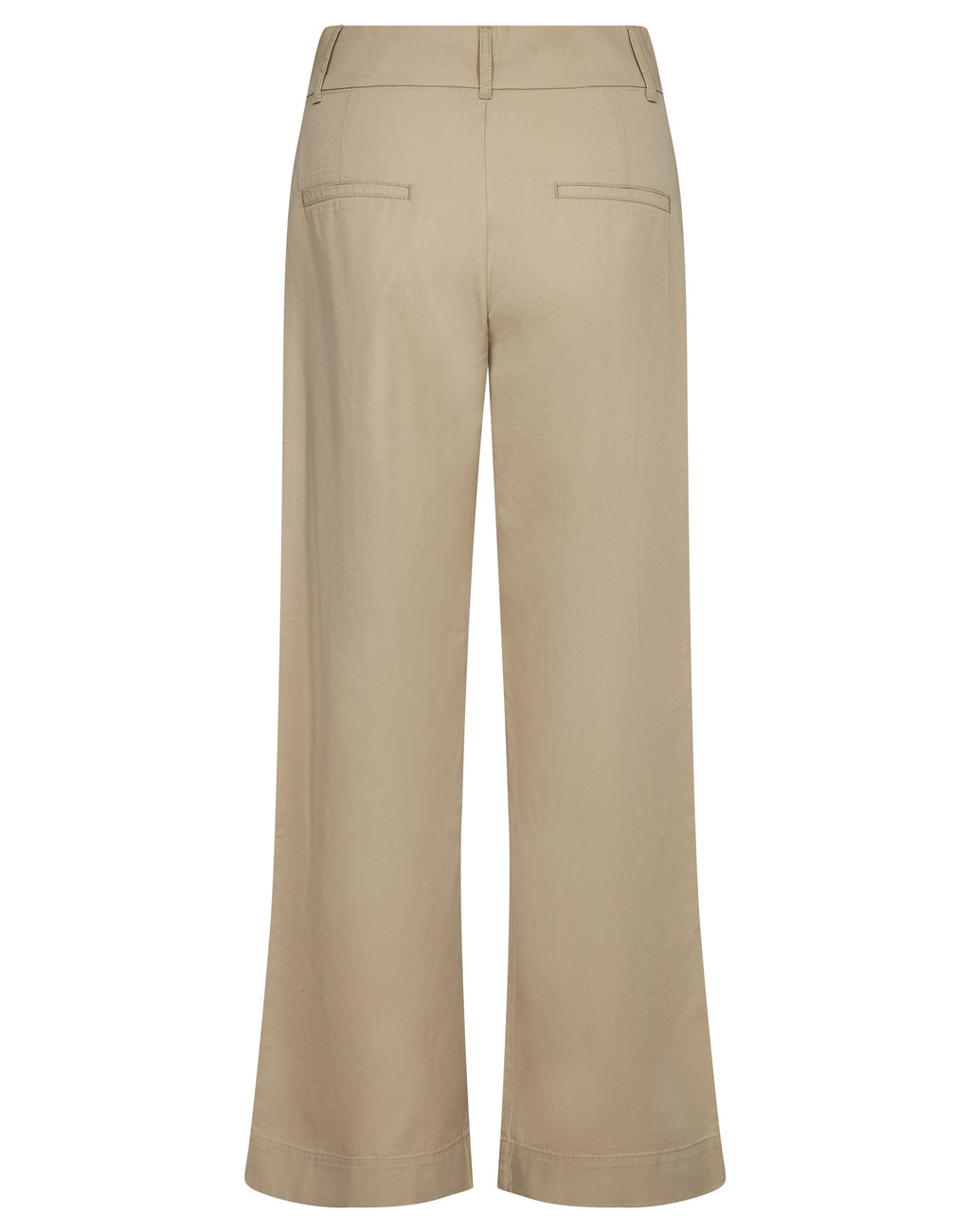Bukserne har en semi-casual silhuet med bred taljekant og bæltestropper, fremstillet i en bomulds- og tencelblanding for komfort og bevægelsesfrihed. De har to frontlommer og to baglommer med falsk veltedetalje samt lukning med hægte, bøjle og lynlås foran.