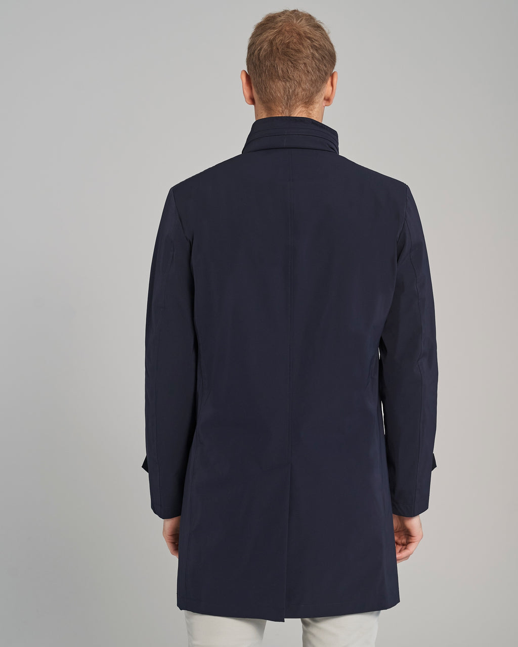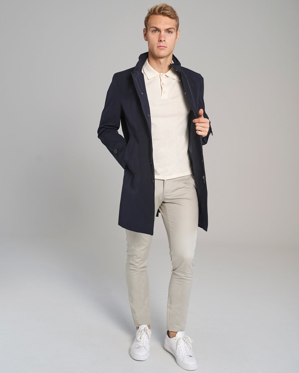 Oeko-tex certificeret navy forårs- og sommerfrakke med formelt udtryk i polyester kvalitet. Slim fit model for et tætsiddende fit.