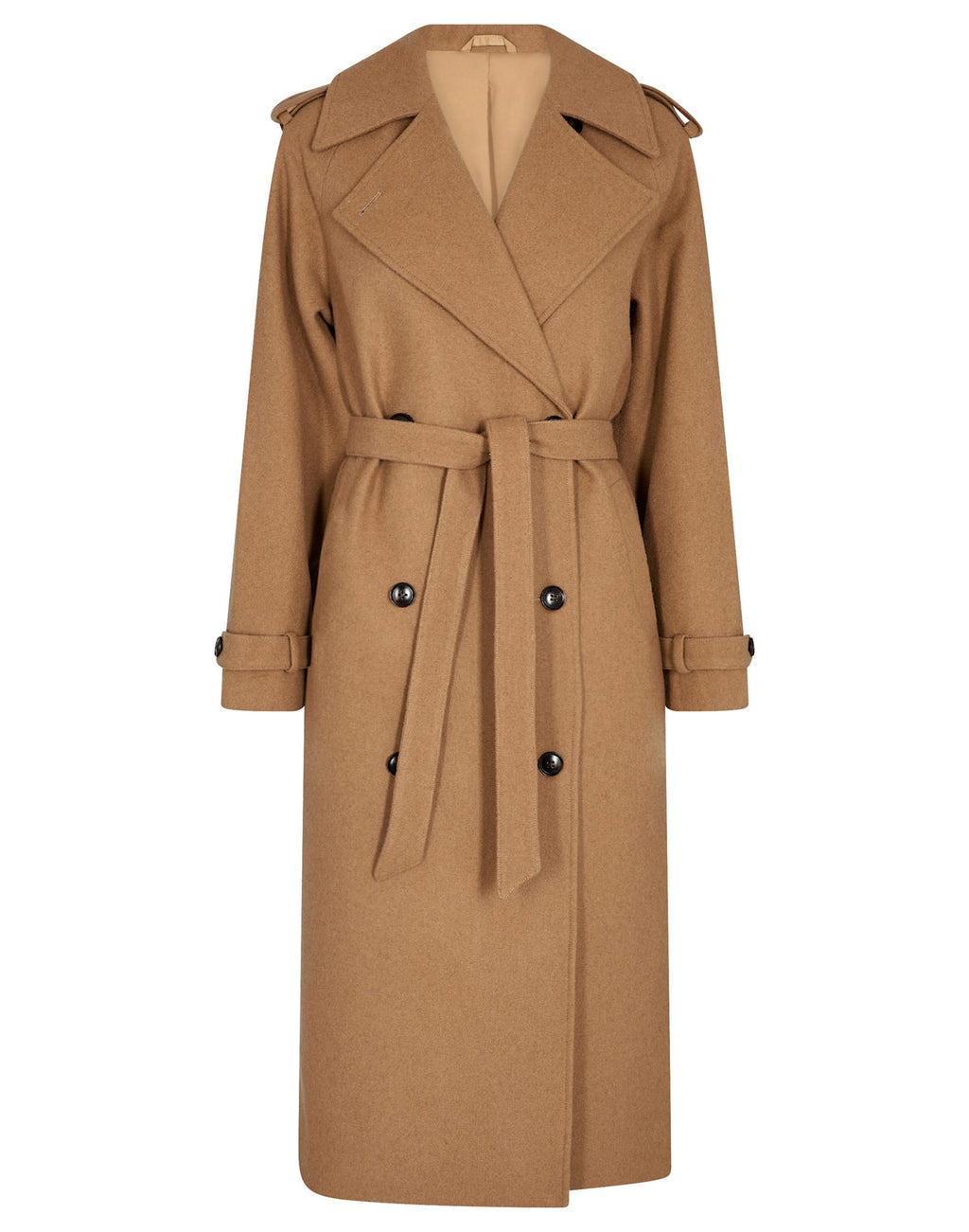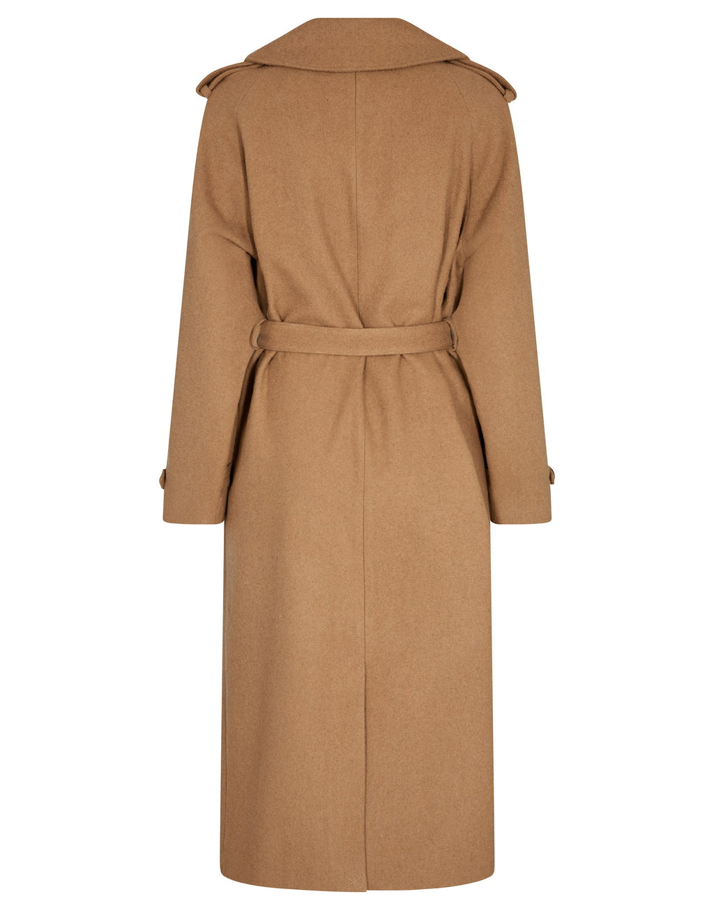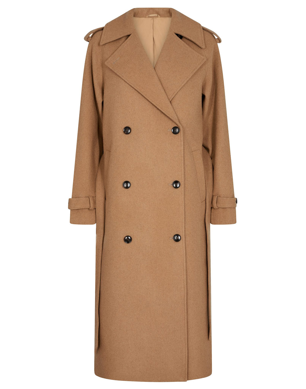 Lang frakke i vævet uld- og polyesterblanding med både knap- og bælte-lukning. Designet med bæltestropper som detaljer på både skuldre og ærmer. Brune hornknapper og polyesterfor fuldender det elegante udtryk. En klassiske frakke, som aldrig går af mode.