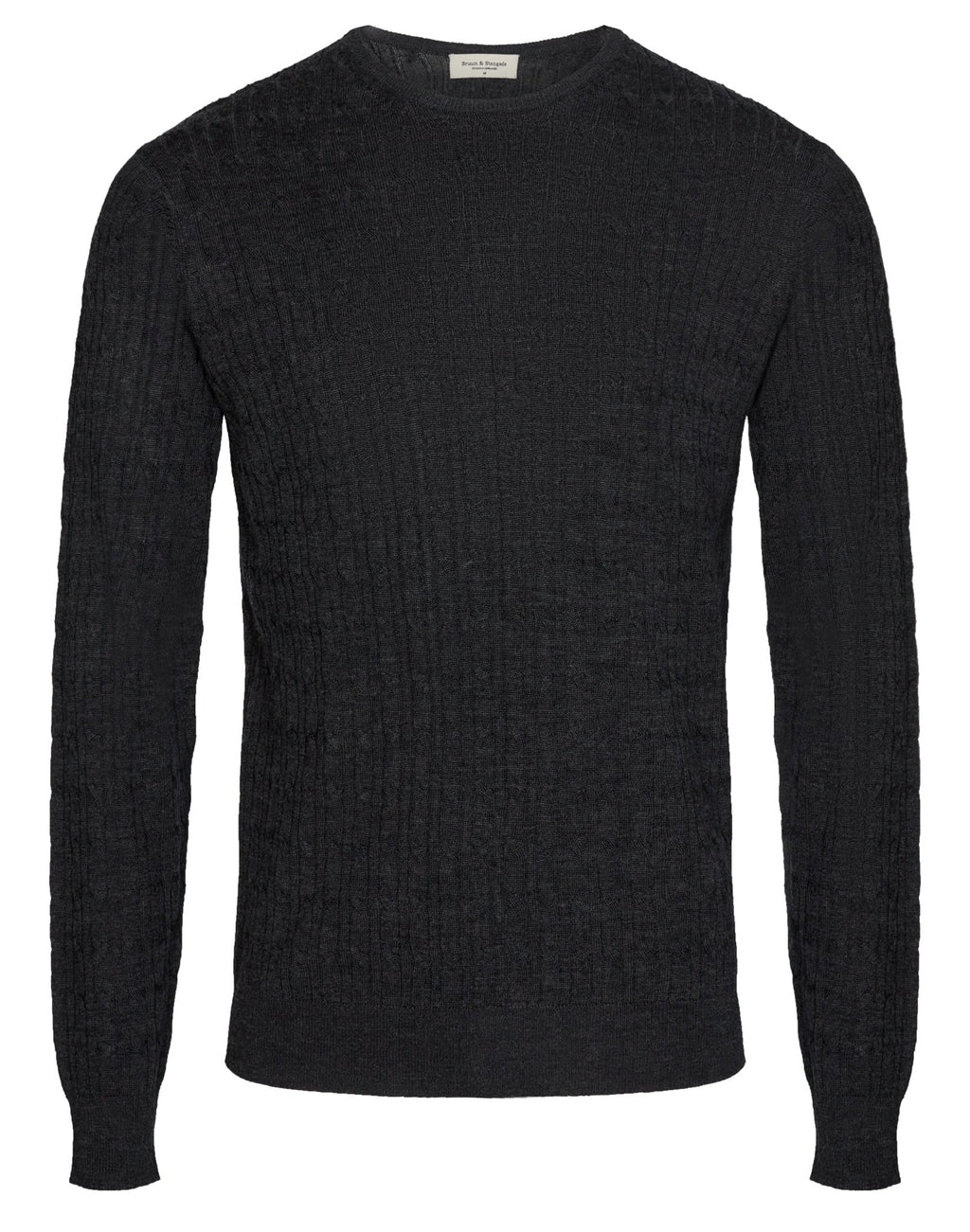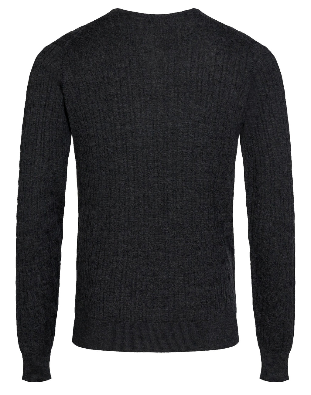 Let pullover i en kabelstrikket uld og akrylbladning. Den har en fin ribdetalje på udskæringen, manchet og forneden. Mønstret giver den et klassisk og elegant look til daglig brug. Da det er en let strik, kan den med fordel styles sammen med andre overdele som en skjorte.
