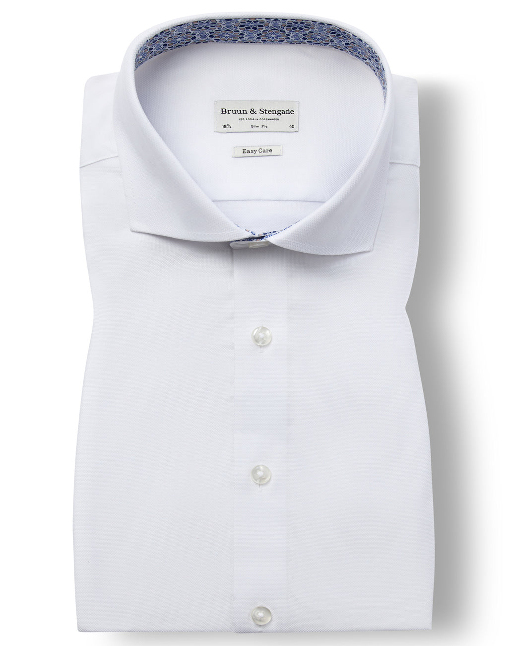 Vores slim fit formelle skjorte er ideel til dig, der foretrækker en mere tætsiddende pasform. Skjorten er fremstillet i 100% bomuld i dobbyvævning, som giver et struktureret og elegant udtryk. Klassisk design med udskåret krave, fransk stolpe med perleknapper og justerbare manchetter.