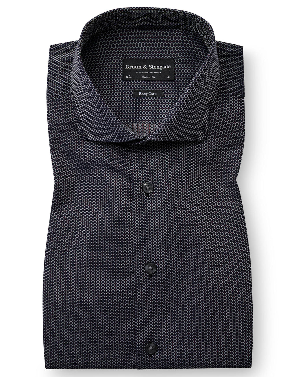 Vores Modern fit skjorte er perfekt, hvis du har brug for eller foretrækker en bredere pasform i krop og ærmer. Skjorten er lavet af 100% bomuld i prikket dobbyvævning og behandlet for at minimere behovet for strygning. Klassisk design med udskåret krave, fransk stolpe med mørke perleknapper og justerbare manchetter.