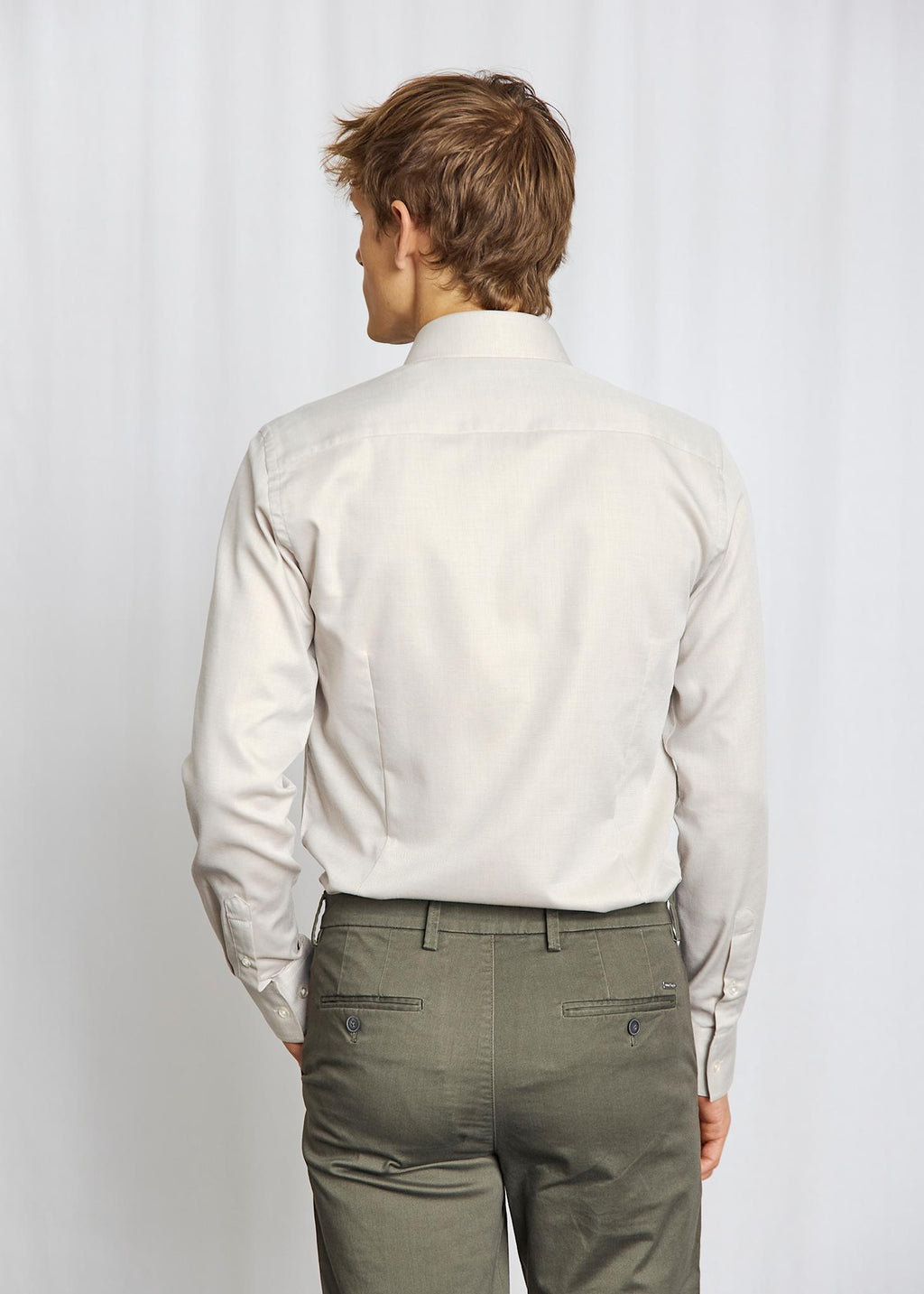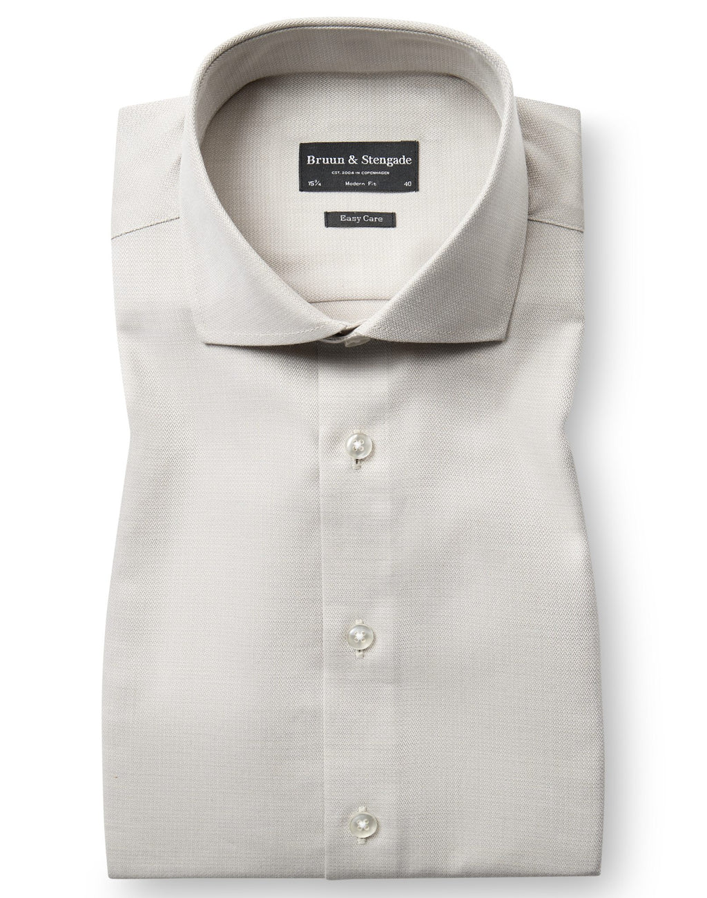 Vores Modern fit skjorte er perfekt, hvis du har brug for eller foretrækker en bredere pasform i krop og ærmer. Skjorten er lavet af 100% bomuld i meleret sildebensvævning og behandlet for at minimere behovet for strygning. Klassisk design med udskåret krave, fransk stolpe med mørke perleknapper og justerbare manchetter.