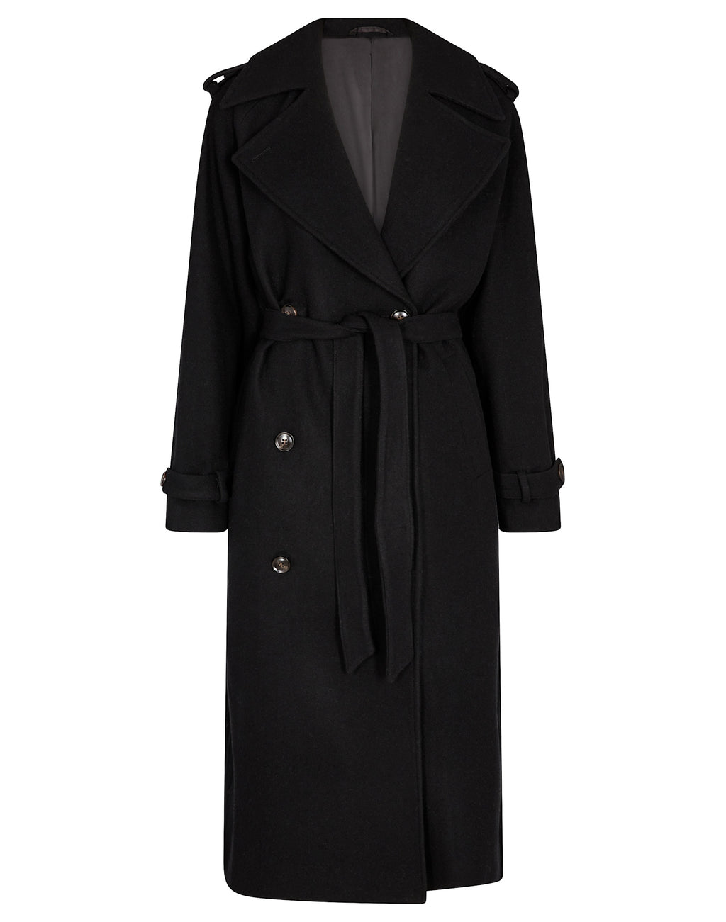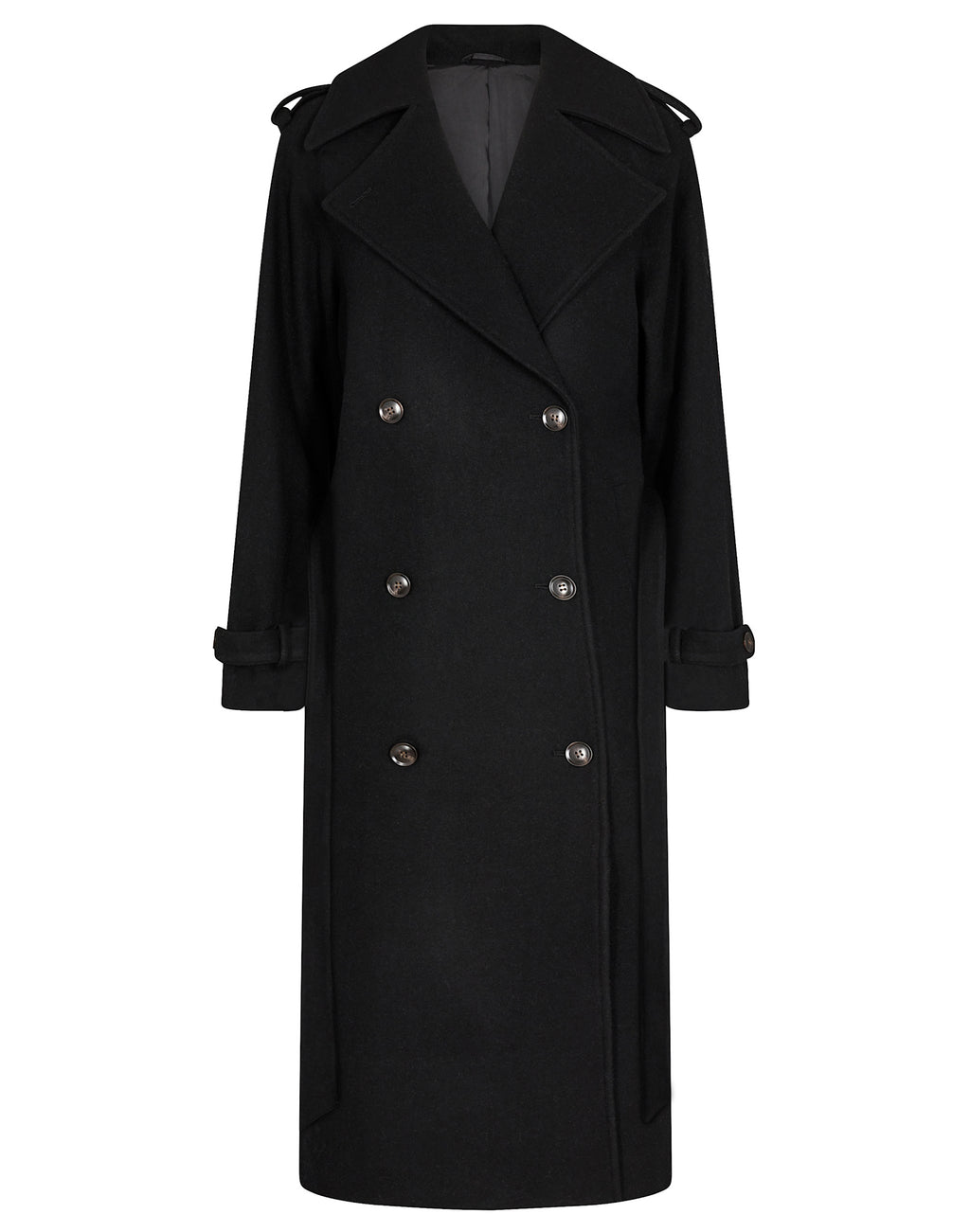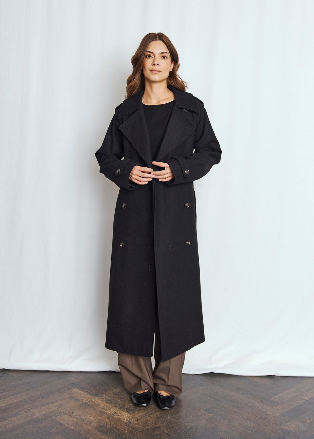 Lang frakke i vævet uld- og polyesterblanding med både knap- og bælte-lukning. Designet med bæltestropper som detaljer på både skuldre og ærmer. Brune hornknapper og polyesterfor fuldender det elegante udtryk. En klassiske frakke, som aldrig går af mode.