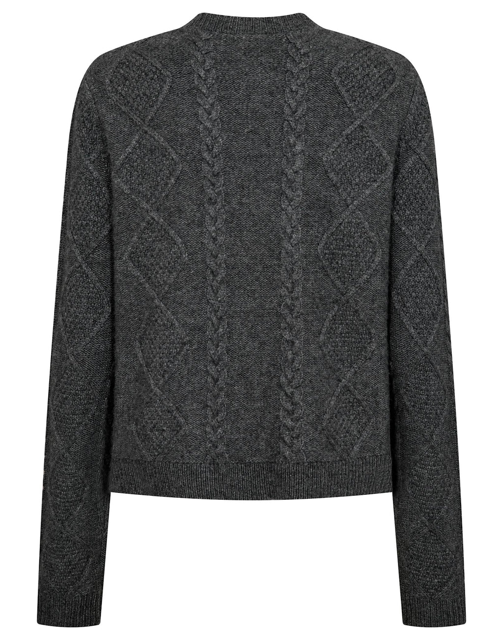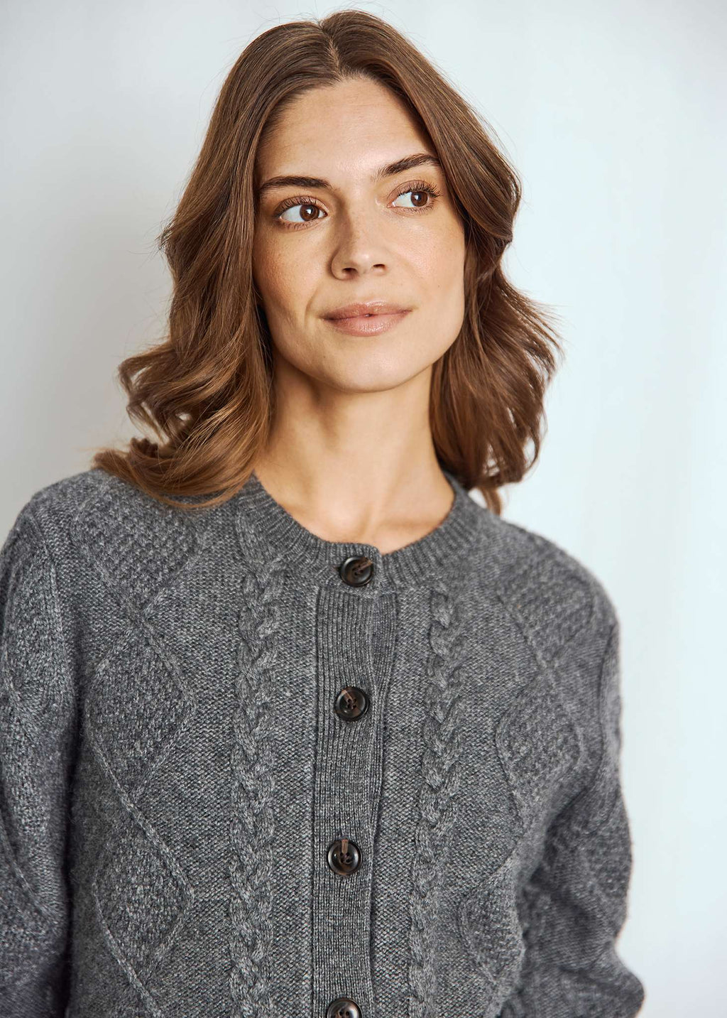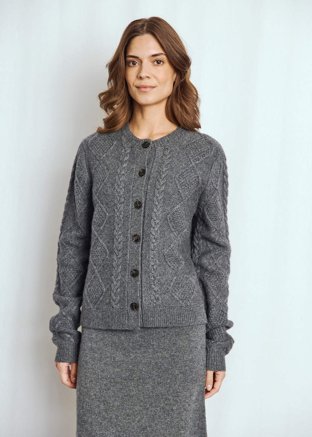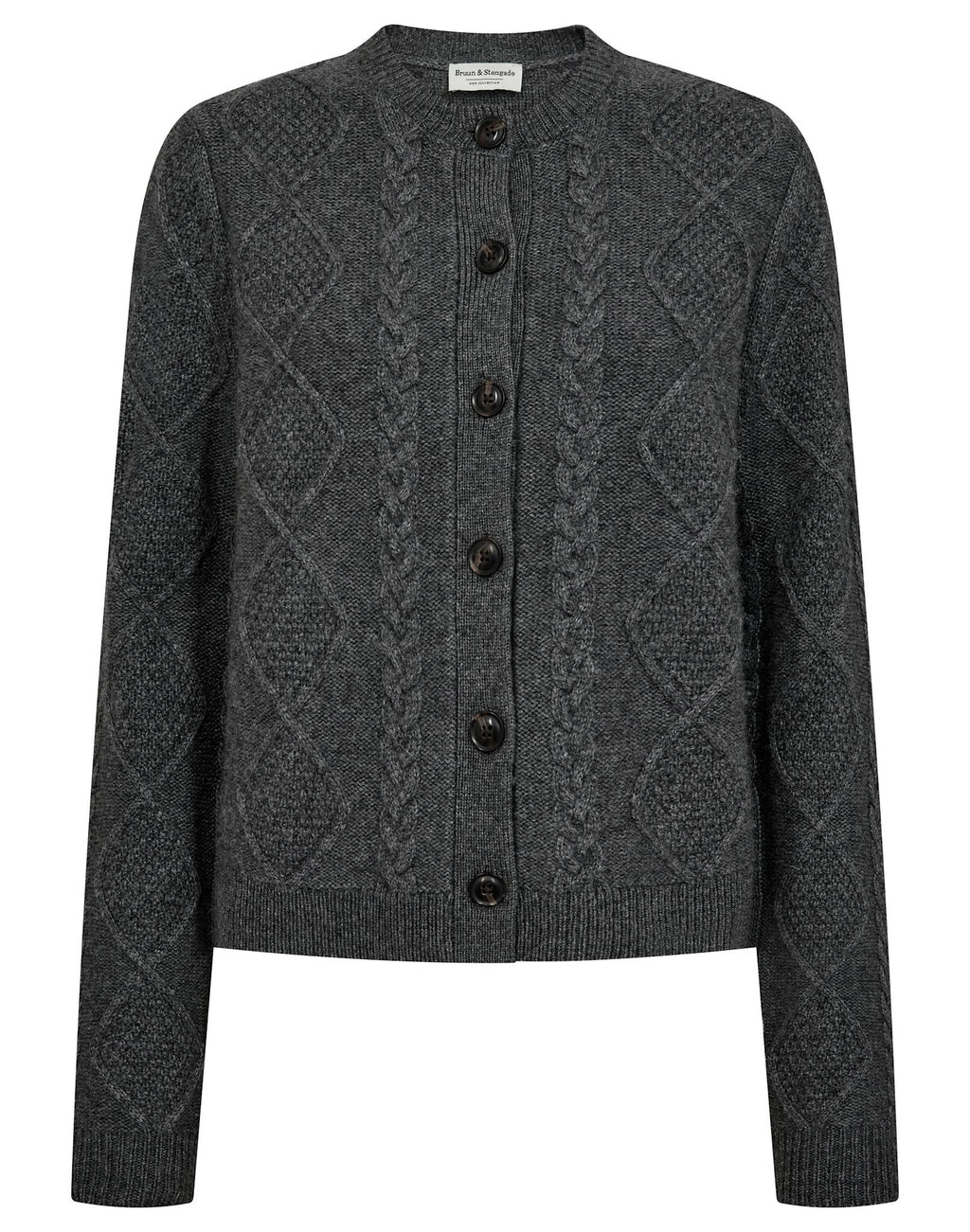 Tung, kabelstrikket cardigan til kvinder i en blød blanding af lammeuld og tencel. Lukkes med hornknapper og har ribdetaljer i krave, ærmer og søm for et klassisk og hyggeligt udtryk. Perfekt med BS June for et gennemført look, eller sammen med et par af dine favorit jeans.