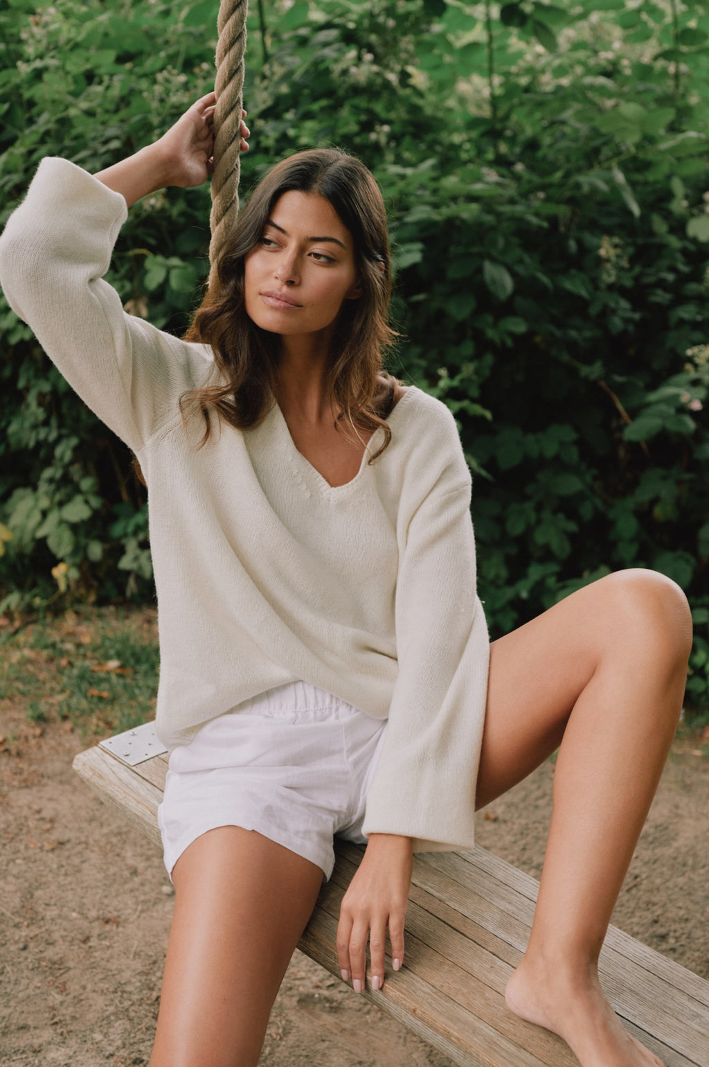 Oversized strikket V-hals lavet i en blanding af polyamid og uld. Vores Juana strik er perfekt til foråret udover en top eller alene. Den findes i to farver og kan eksempelvis blive styles med vores Lia bukser.