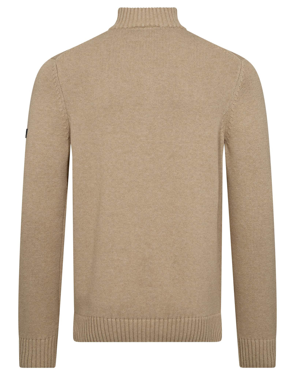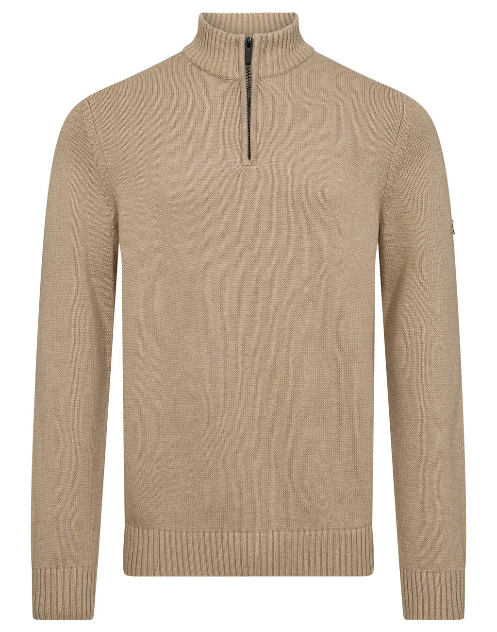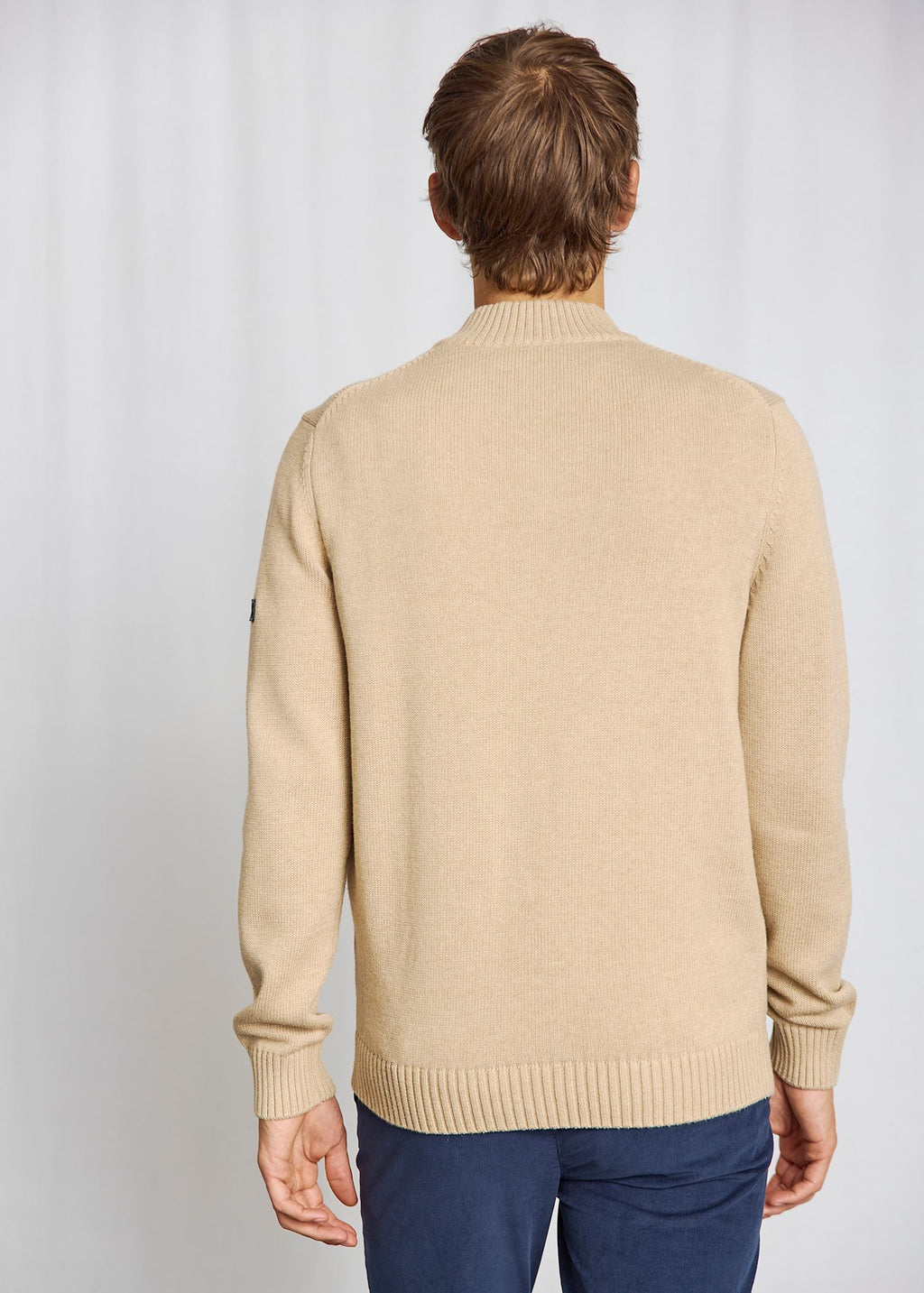 Kraftigstrikket half-zip sweater til mænd i 100% bomuld. Designet med høj krave og diskret gummilogo på ærmet – en alsidig tilføjelse til din garderobe, perfekt til både hverdag og fritid.