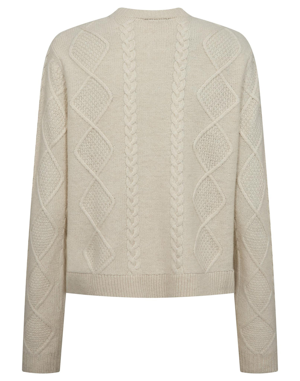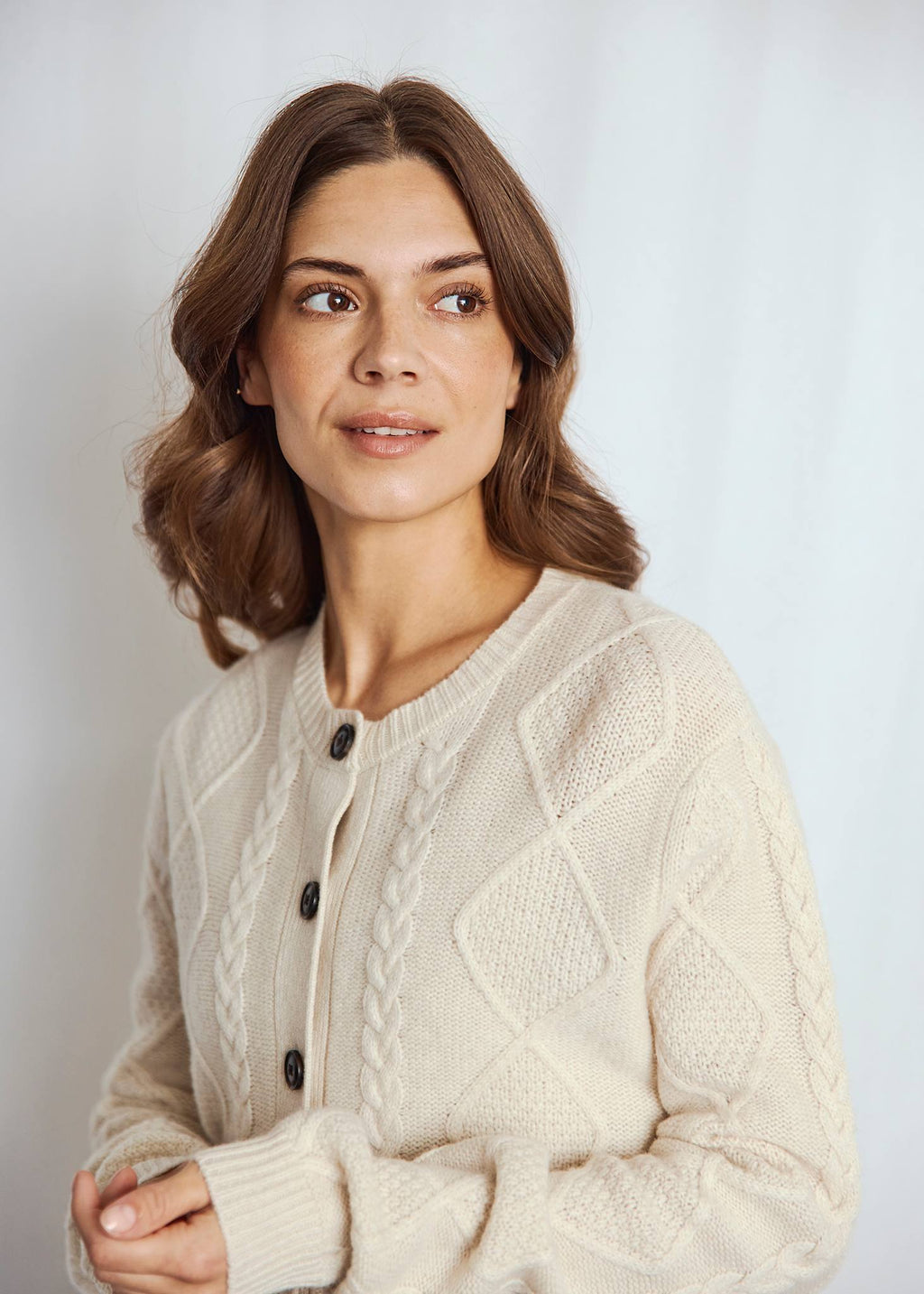 Tung, kabelstrikket cardigan til kvinder i en blød blanding af lammeuld og tencel. Lukkes med hornknapper og har ribdetaljer i krave, ærmer og søm for et klassisk og hyggeligt udtryk. Perfekt med BS June for et gennemført look, eller sammen med et par af dine favorit jeans.