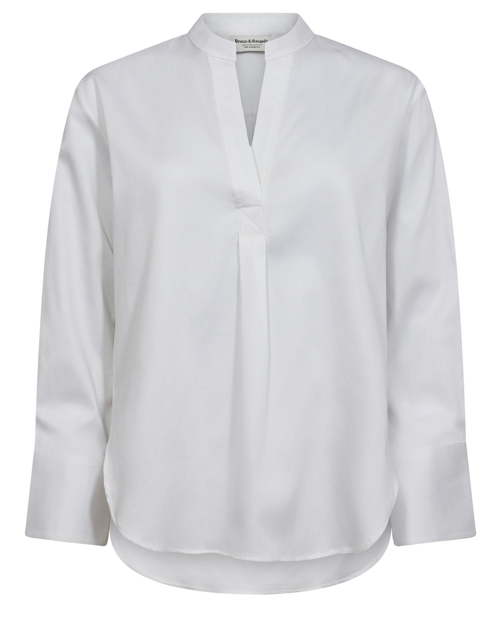 Klassisk V-udskåret skjorte i glat satinvævet bomuld med elastan for ekstra komfort. En feminin og tidløs style, der fungerer både til hverdag og mere formelle anledninger.